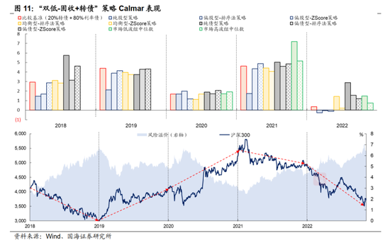 有意思的一点是,在偏股型策略中,排序法策略的波动率往往小于 Z-Score 策略,而在偏债型策略中,排序法策略的波动率往往大于 Z-Score 策略。因此, 如果出于降低波动的考虑,在偏股型策略中排序法更优,而在偏债型策略中, Z-Score 筛选法更优。