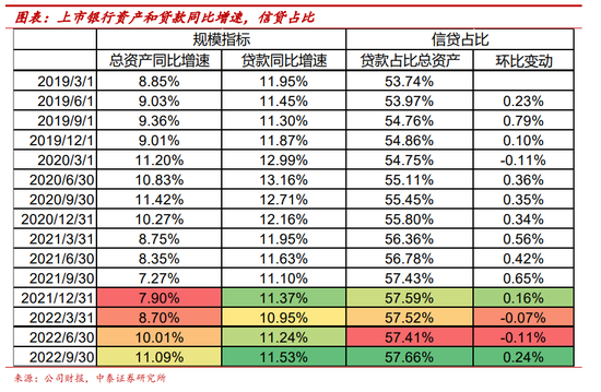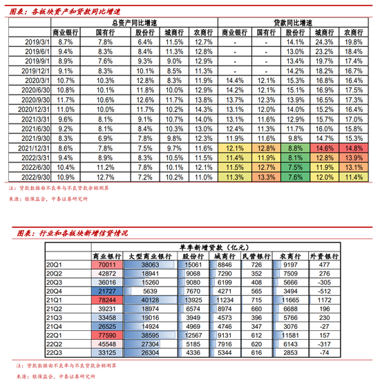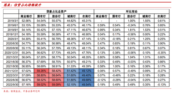 行业三季度资产增速继续提升,板块间分化较为明显。国有行是信用扩张的主要支撑,股份行仍面临资产荒的问题,农商行信贷投放则面临大行冲击、较去年同期有下降。从资产增速看,行业三季度资产同比增速提升0.5个百分点至10.9%,其中信贷同比增11.3%,高于总资产增速;行业单季信贷规模在3.3万亿,与去年同期基本持平。分板块看:1、国有行是信贷支持实体经济的重要担当,也是3季度行业信用扩张的主要主体。单季新增信贷2.6万亿,同比多增7288亿,总资产同比增速较2季度继续提升1.5个百分点至12.7%,信贷同比较2季度提升0.6个百分点至13.3%。2、股份行则仍面临从去年3季度以来的资产荒问题,单季新增信贷不足4400亿,但同比21年同期略有提升。在地产产业链下行、同时疫情新生变量扰动因素下,股份行去年3季度开始信贷同比增速就有一定下行,今年2季度信贷同比增速则进一步放缓至7.5%,3季度略有回升至7.6%。3、农商行信贷投放较去年同期下降。预计主要受到大行下沉的影响,农商行三季度贷款投放仅为2853亿元,贷款同比增速也较二季度下降1.7个百分点至11.4%。信贷占比方面,国股行、城商行信贷占比小幅提升,农商行信贷占比有小幅下降,分别占比59.0%、59.1%、52.2%、49.5%。(本文信贷数据由不良余额和不良率测算,增速与央行金融数据有误差)。