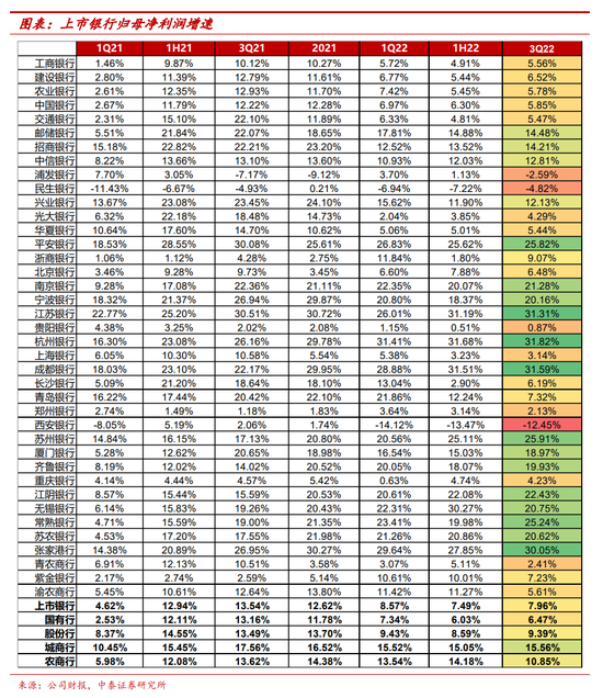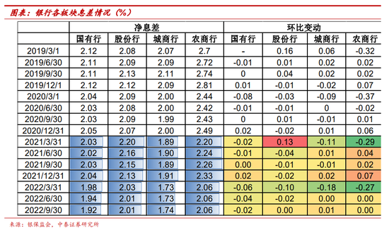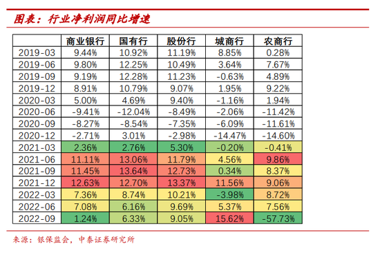 2022前三季度商业银行净利润同比增1.24%,增速较2季度有所放缓,主要是受农商行同比利润大幅下降影响。分板块看,除农商行外,其他类型银行前三季度净利润均有所增长。国有行、股份行、城商行分别同比增6.3%、9.1%、15.6%,其中国有行净利润增速有0.2个百分点的提升,股份行则有0.6个百分点的微降,城商行同比增速靓丽,提升达10.3个百分点。而农商行同比-57.73%,预计一方面由于大行下沉下农商行面临较大的经营压力,同时8月26日,辽阳农商行、辽宁太子河村镇银行进入破产程序,体现出农村金融机构在经济下行的背景下抗风险能力较弱,面临一定的信用风险,因此对利润也有一定负面影响。