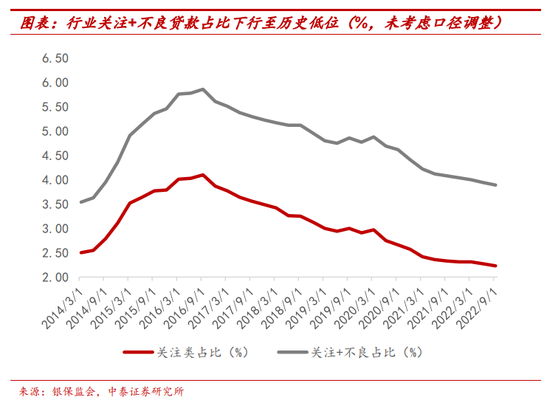 关注类贷款占比环比继续下行,下行幅度高于不良率下行幅度,至历史最优水平,行业未来可能向下迁移为不良贷款的规模可控,行业当前资产质量是较为干净的一个水平。3季度关注类贷款占比为2.23%,较2季度继续下行4bp。