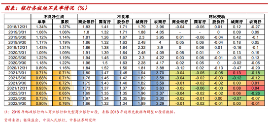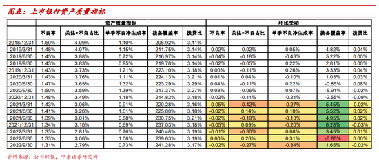 行业不良率环比继续下行,稳健性继续好于预期。具体来看:1、行业整体不良率环比下行1bp,不良已经下行至2015年底的水平。2022年9月末全银行业不良贷款规模为3万亿,环比2季度小幅增373亿,不良率1.66%,环比下行1bp。2、各板块变动与整体变动基本一致。国有行3Q22不良率环比下行2bp至1.32%,股份行不良率则下降1bp在1.34%,是2015年6月以来最优水平。城商行不良率稳定在1.89%,农商行下行1bp至3.29%。