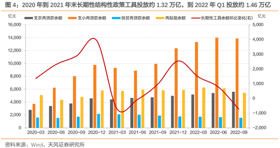 2020年到2021年末,支农、支小、扶贫再贷款和再贴现余额增长约1.32万亿元,比2.3万亿少约9800亿元,而当时的阶段性工具运用远比这个数额少(例如截止到2022年6月普惠小微贷款支持工具、碳减排支持工具、支持煤炭清洁高效利用专项再贷款等合计仅2200亿元左右),因此我们推测2.3万亿中也包含了定向降准释放的长期流动性。