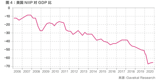 但是,2019年后美国的经常项目又重新恶化。2021年经常项目逆差达到8216亿美元(同期的贸易逆差为8591亿美元),经常项目逆差对GDP回升到3.6%。与此同时,自2018年起,NIIP对GDP比开始快速上升,至2021年美国的NIIP高达18.1万亿美元,NIIP对GDP比超过70%(图3、图4)。