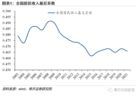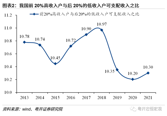 三是贫富差距拉大导致整体边际消费倾向下降,消费分层折射出收入分层和社会分层,高收入人群消费升级和低收入人群消费降级并存。低收入人群边际消费倾向高,但收入占比偏低。我国居民收入基尼系数在2015年触底后上升至2021年的0.466。根据五等分划分,2021年的前20%高收入户与后20%的低收入户可支配收入之比为10.3倍,其中城镇高收入户与低收入户可支配收入之比6.1倍,农村为8.9倍。此外,考虑到财产性收入,社会贫富差距更大。