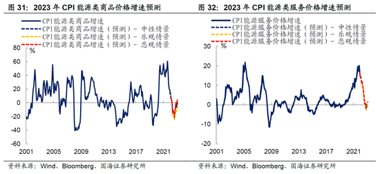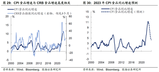 1) 食品方面,可以考虑用CRB食品指数作为CPI食品项的领先指标。通过拟合未来CPI食品项价格的环比变动速度,来推演2023年食品项价格的同比增速。