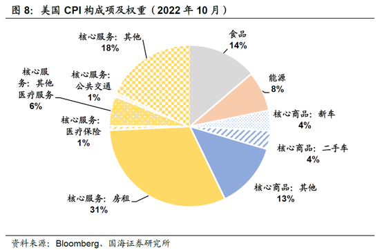 1) 房租项将是2023年拉动核心通胀下行的主要变量之一。由于房租项是核心通胀的最大构成项,疫情后美国地产市场火热,房价房租双双高走,是目前美国通胀居高不下的核心原因,然而我们认为这一现象将在2023年发生改观。