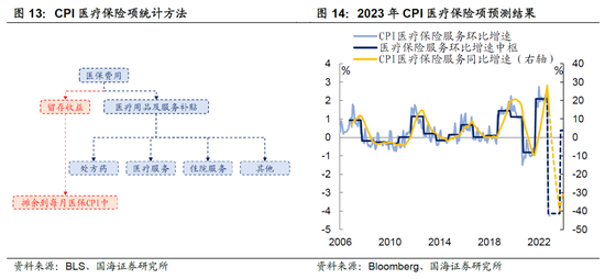 2) 医疗保险服务在核心项中占比不高,但将是2023年拉低核心CPI的另一大核心科目。由于医疗保险项的统计方法与其他一般CPI项目统计方法不同,主要通过计算美国医保企业当年的留存收益,再摊余到未来一年进行计算。这就造成了,历史上来看,医保价格的环比增速总是呈现阶梯状变化。