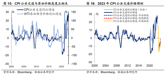 3) 公共交通项与能源价格高度相关,2023年也将对核心CPI形成一定拉低作用。由于CPI公共交通项中包含了机票、巴士、火车等公共运输服务价格,因此,公共交通价格从历史上来看与WTI原油价格呈高度正相关。