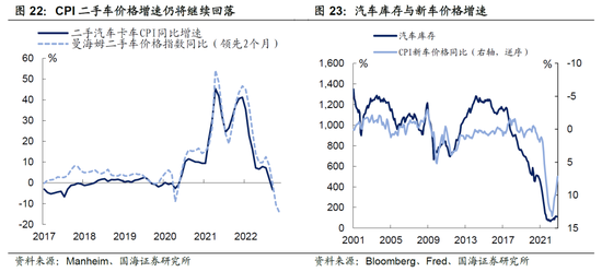 1)新车和二手车项,在全美汽车库存回补,以及美国地产逐渐降温格局下,2023年增速进一步回落确定性较强。2)其他核心商品项,大概率将继续维持回落态势,但是在具体回落幅度上仍有较高不确定性,具体取决于全球供应链会否再次受阻,以及是否会涌现新的地缘冲突推高大宗商品价格。
