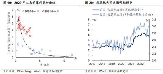 其他核心服务项价格是美国2023年核心通胀中最大的不确定因素,主要原因在于,一方面其他核心服务在核心CPI中占比不低,有18%左右。另一方面,薪酬和核心服务通胀增速很难具体量化。针对后者,我们认为可以从“菲利普斯曲线”角度入手,即失业率与通胀通常呈现反向关系。