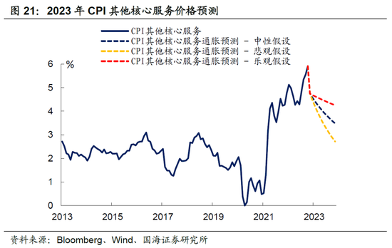 目前美国就业市场逐渐出现一定松动的迹象,2023年失业率进一步走高将是大概率事件,然而问题在于失业率上升能够带来多大的其他核心服务通胀下降?