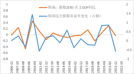 “指数涨幅-名义GDP增速”与实际市盈率差异(韩国)