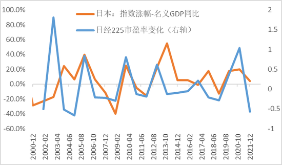 “指数涨幅-名义GDP增速”与实际市盈率差异(日本)