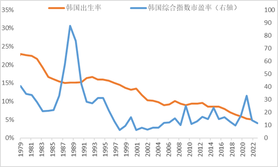 韩国出生率与韩国综合指数市盈率走势图