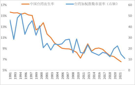 中国台湾出生率与台湾加权指数市盈率走势图