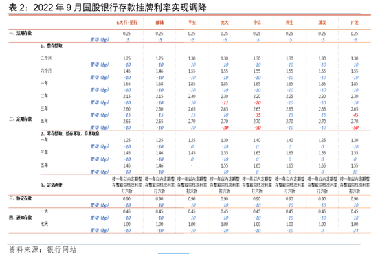 但存款利率降幅仍远不及贷款,银行净息差依然承压。人民币存款挂牌利率下调有助于引导负债成本下行,但存款成本、理财收益率下行后,也带动部分活期存款和理财加速向定期存款迁移,导致存款平均成本率整体下降幅度不大。截止2022年9月末,国股行对公定期、零售定期存款新发放加权平均利率分别为2.28%、2.64%,较年初分别改善12bp、-17bp,零售存款利率反而逆势上行。