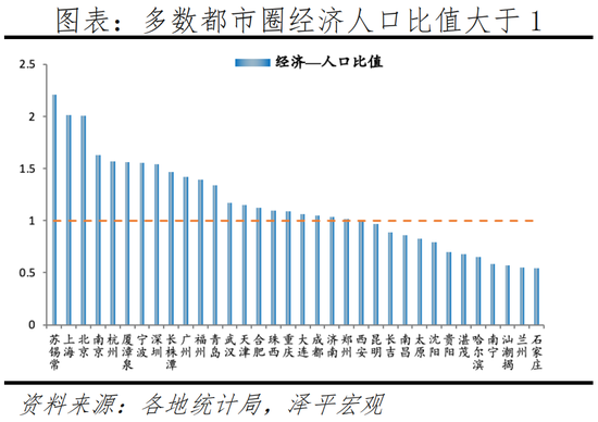 中国人口和产业持续向大都市圈集聚,未来大都市圈人口占比仍将继续提升。中国34个1000万人以上大都市圈人口总体持续流入,2021年常住人口合计占比62.8%,经济总量占比77.6%,经济-人口比值为1.24,人口仍有流入倾向。在34个千万级大都市圈中,苏锡常、上海、北京等3个都市圈经济-人口比值大于2;南京、杭州、厦漳泉、宁波、深圳等5个都市圈介于1.5-2.0之间;长株潭、广州、福州、青岛等14个都市圈介于1-1.5之间;昆明、长吉、南昌等12个都市圈经济-人口比值小于1,且部分都市圈经济-人口比值较低与划分范围过大有关。