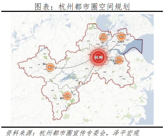 2020年杭州都市圈全面进入“后二绕”时代。杭州都市圈于2007年启动建设,最初包含杭州、嘉兴、湖州、绍兴4市;2014年国家发改委批复杭州都市圈经济转型升级综合改革试点;2016年《长三角城市群规划》中杭州都市圈位列“五圈”之一;2020年《杭州都市圈发展规划(2020-2035年)》正式通过,杭州都市圈即将进入“后二绕”时代。2020年《杭州都市圈综合交通发展规划(2020-2035)》发布,提出加快建成都市圈城际铁路一期,谋划嘉湖城际、杭海城际延伸等项目。并计划杭绍城际线延伸至杭州东站、利用浙赣线开通杭诸城际,形成“一小时通勤圈”。目前,杭嘉湖绍四市已实现“市市通高铁、县县通高速、镇镇通干线、村村通班线”目标。高铁方面,杭州与嘉湖绍市区已实现“半小时高铁圈”,德清、桐乡等地到达杭州市区时间仅为15分钟,通勤高铁“西施号”在杭州东站与诸暨之间的运行时间约为25分钟。杭衢高铁计划于2022年建成,届时从衢州40分钟可达杭州西站,90分钟可达上海。高速方面,2020年12月杭州绕城高速西复线(杭州二绕)、千黄高速浙江淳安段、临金高速建德至金华段通车,标志着全省全面实现“县县通高速”,杭州都市圈全面进入‘后二绕’时代,以杭州都市圈高速公路环线为纽带,串联德清、安吉等区县市,构成千万级人口规模、功能联系紧密的同城化城镇发展环。