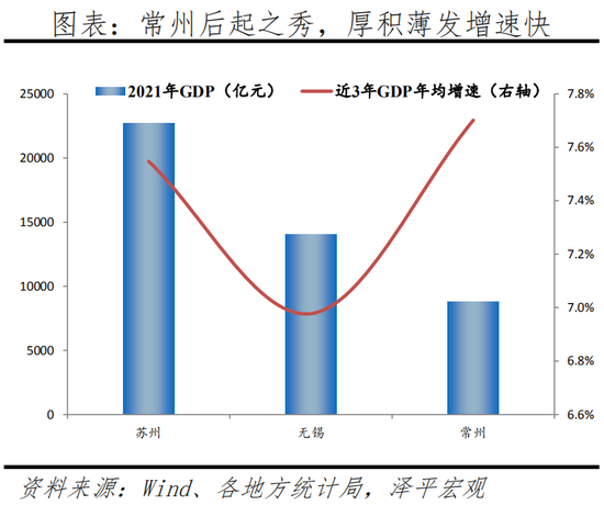 苏锡常都市圈位于长江三角洲,包括苏州、无锡、常州三市,共汲太湖之水衍生了细腻清新的吴文化。目前苏锡常圈是国内二级城市圈中经济实力第二强的都市圈,苏锡常面积有15056平方公里,2021年末常住人口2568万。苏锡常处于距上海200公里的上海大都市圈圈层范围内,其快速发展受益于上海的直接影响。一方面,苏锡常一体化是各自城市发展的求变求新,另一方面,也是围绕上海这个强劲发展极,放大其经济溢出效应,作为经济腹地,在承担上海功能扩散及参与国际分工的过程中成长为独立完整的强劲增长区域,逐渐达到以上海为中心、与上海优势互补、错位发展的格局。值得注意的是,苏锡常三市皆非直辖市、副省级城市、计划单列市或沿海城市,因此抱团发展显得更加重要。从经济实力看,2021年苏州GDP总量居全国第6、地级市之首,人均GDP全国第4,一般公共预算收入仅次于北上深。人口方面,苏州是省内唯一人口破千万城市,近十年人口比重、增量、增速稳居第一。在江苏省内,相比于2021年苏州市GDP2.3万亿,南京、无锡、南通GDP分别为1.6、1.4、1.1万亿。而常州市,2021年地区生产总值达8808亿元,增速9.1%,从目前的发展势头来看,常州在未来一到两年内,有希望冲击“万亿俱乐部”,成为江苏的第五座“万亿之城”。