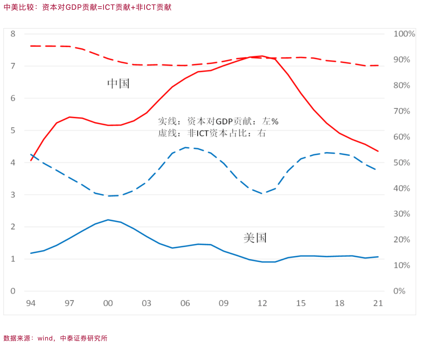 从中美经济增长的贡献比较看,中国资本投入对GDP增长贡献已经显著超越美国,但就ICT(信息、通信和技术)在其中的占比而言,中国仅为10%左右,而美国已过半。可见,中国经济增长过度偏重于一般资本的投入而非技术进步。