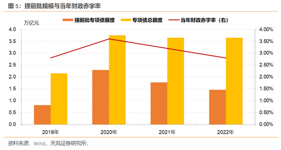 提前批规模一定程度上反映了对应年度的财政政策态度。提前批额度早下达、多下达,说明财政节奏前置,对应财政态度更积极,当年的赤字率安排通常较高。