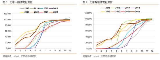 对于专项债而言,在两会召开月结束前,实际发行规模占当年新增限额的比例分别为30.9%(2019年)、57.4%(2020年)、0.72%(2021年)、31.3%(2022年考虑了追加5000多亿元结存限额)。提前批下达较晚的2021年,其发行进度也较慢。