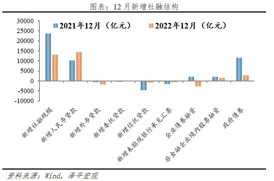 2)表外融资同比大幅少减。12月表外融资减少1418亿元,同比少减4970亿元。其中,新增未贴现票据减少552亿元,同比少减867亿元。新增信托贷款减少764亿元,同比大幅少减3789亿元,“保交楼”借款带动信托融资,叠加到期规模减少,信托净融资同比大幅少减。委托贷款减少102亿元,同比少减314亿元。或因前期政策性开发性金融工具投放阶段性收尾,委托贷款对社融的支撑不及8-10月。