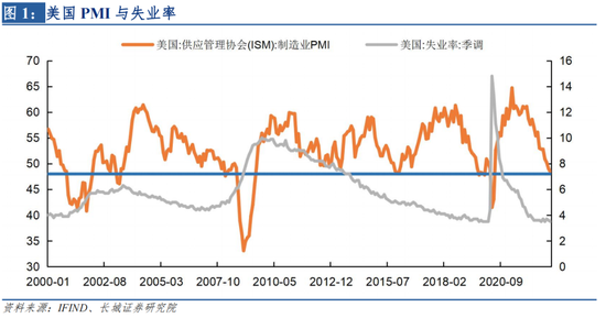 通常而言,50%是PMI指数的荣枯线,但在美国,48%可能才是重要临界线。从历史数据看,2000年以来美国PMI指数有五次跌破48%大关,每次失业率都出现明显拐点,分别是2000年网络泡沫破裂,2003年非典疫情、2008年次贷危机期间两度跌破48%,以及2020年新冠疫情。