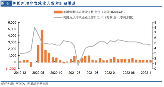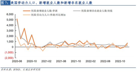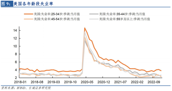 2022年12月,美国55岁以上劳动参与率38.8%,而2019年的平均值为40.2%。如果恢复到2019年的劳动参与率,经粗略估算,美国会新增54万55岁以上劳动力人口,而美国目前新增就业都集中在酒店、旅游、餐饮等疫情复苏行业,55岁以上劳动力人口并不适合。从失业率也能看出,12月55岁以上劳动力失业率在回升,而其他三个年龄段的失业率都是下降。如果把这部分因疫情退出劳动力市场的人计算在内,12月的失业率应该为3.8%。