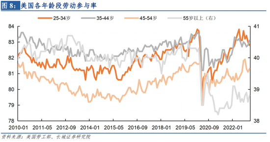 我们再看一下美国劳动力供给减少的原因。现在我们已经知道美国劳动力人数低增长(甚至多次出现减少)是就业市场紧张的主要原因,而劳动力参与率就是衡量劳动力人数的主要指标。从数据来看,除了55岁以上的劳动参与率还在较低水平,其他年龄段人口都基本恢复到疫情前水平。美联储主席鲍威尔称,250万劳动力缺口是因为疫情造成健康原因导致的提前退休。这或许就是这次新冠肺炎疫情对美国居民造成的永久疤痕。