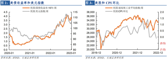 自从2022年11月以来,全球金融市场就被美国货币政策收紧预期和放松预期左右裹挟。美国10月CPI同比7.7%,大幅低于市场预期,加强了投资者对于加息即将放缓的预期,整个11月都是美股反弹、美债利率下降的risk-on模式。到了12月初,美国公布11月失业率3.7%,这一强劲数据让市场加息预期提高,美联储也如期加息50BP,美股下跌,同时美债收益率回升,市场进入risk-off模式,收紧预期再起。到了2023年1月,12月劳动力市场数据好于预期,平均时薪增速继续下滑。这些数据刺激了市场。1月6日,美元指数从105.6回落到103.8,道琼斯工业指数上涨2.13%。