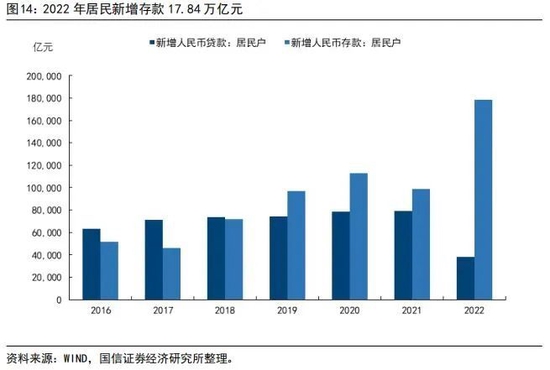 2022年居民持续去杠杆,去年累计新增居民存款17.84万亿元,同比多增7.94万亿元,创历史新高。我们在报告《居民存款高增缘由和影响探析》(20230108)中指出,居民存款高增核心原因是疫情冲击下居民收入增速下降,且未来不确定性加大,居民预防性储蓄意愿增强。同时,疫情对消费场景破坏较大、房地产市场景气度低迷,以及资本市场表现欠佳等因素,消费和投资行为难以开展,带来居民被动储蓄的增加。