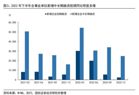 2022年一二季度企事业单位新增融资规模中短期融资比重分别为35.7%和39.4%,三四季度该比例分别降为13.9%和8.9%。年末企业中长期融资余额同比增速为10.0%,较4-5月份低点反弹了1.8个百分点,表明下半年企业融资意愿有所好转。但下半年,尤其是四季度企业中长期贷款对企业债券有明显的替代效应,或也反映了企业主动加杠杆的意愿仍不强。