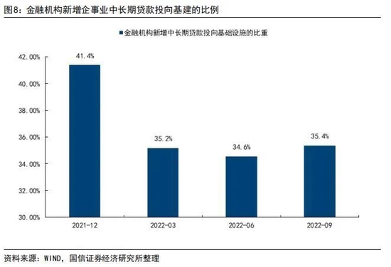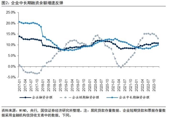 2022年一二季度企事业单位新增融资规模中短期融资比重分别为35.7%和39.4%,处在历史较高水平,但三四季度该比例分别降为13.9%和8.9%。同时,企业中长期融资余额同比增速在2022年4-5月份筑底后持续反弹,年末企业中长期融资余额同比增速为10.0%,较4-5月份低点反弹了1.8个百分点,且该趋势仍在延续,表明下半年企业融资意愿有所好转。