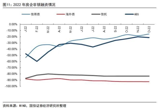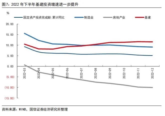 通过分析2022年居民和企业的资金来源和去向,2022年居民全年都在持续大力度去杠杆,消费和投资需求疲软。由于消费需求下降以及企业经营未来不确定性较大,上半年企业投资意愿持续下降,但下半年在稳增长政策持续加码的背景下,企业中长期融资逐步好转。其中,下半年政策性开发性金融工具推出,财政政策持续发力,基建进一步高增,是带来中长期融资好转的主体,预计2023年基建仍将维持高增,但增速较2022年难以进一步抬升。上半年制造业投资大幅下降,但下半年有所企稳,防疫政策优化后制造业对未来经济的信心有所增强,预计2023年投资意愿将有所好转。房地产2022年景气度低迷,房企融资持续大幅恶化,四季度在密集政策出台支撑下,房企融资下降幅度有所放缓,但景气度仍比较低迷。房地产景气度反转需要看到销售端数据的好转,未来仍具备较大的不确定性。但我们认为2022年房企投资意愿已经筑底,2023年将有所反弹,但房住不炒大基调下预计反弹空间有限。