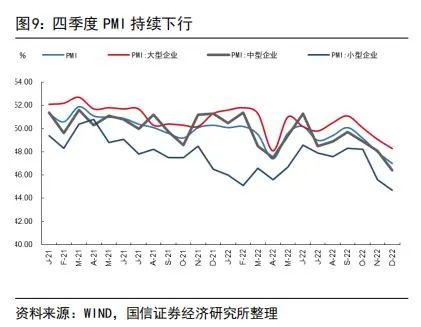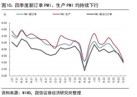 四季度防疫政策优化后,感染人数快速上升、劳动力出现暂时性短缺,部分地区的服务消费活动受到限制,给经济带来较大冲击。四季度制造业PMI指数、PMI新订单指数和PMI生产指数等都出现了大幅下降。加上出口增速的回落,PMI新出口订单指数也是出现了大幅下降。但暂时性冲击并没有对制造业投资活动带来较大影响,2023年伴随经济复苏,预计制造业企业投资意愿将有所好转。