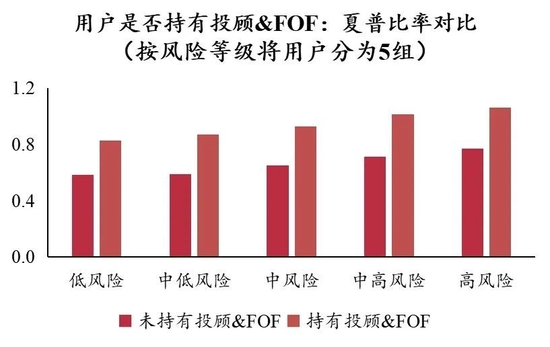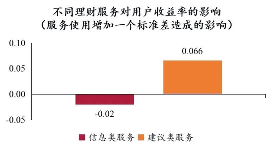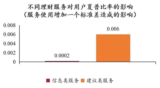 如图所示,不同理财服务对用户收益率的影响有所差异。互联网时代信息爆炸,因此信息类服务可能无法帮助到个人投资者提高收益率,但智能投顾(理财建议类服务)可以明显提高用户的年化收益率,提升幅度高达6.6%。考虑到夏普比率的影响,如果采用平台投顾的建议,控制风险后的收益率也能得到提高。由此可见,互联网理财确实能够帮助到个人投资者。