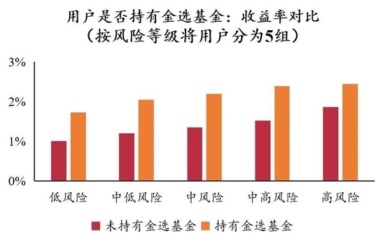 其次是选基行为。目前市场上的公募基金产品数量已经超过1万只,个人投资者想要从中挑选出适合自己的基金无疑非常困难,因此各大互联网财富管理平台都会帮助投资者进行选基,提供金选基金服务。就是按照基金规模大小、历史表现以及基金经理的行为特征等指标,筛选出表现较好的基金。选择金选的基金可以显著提高收益率,年化提升幅度在1%~2%。