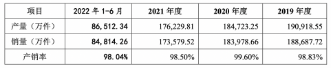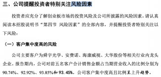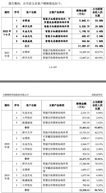 招股书相关数据显示,2019年度到2022年上半年,贝隆精密前五大客户为舜宇光学、安费诺、长益光电、海康威视、大华股份,前五大客户的销售收入占公司当期营业收入的比例分别为2019年90.74%、2020年92.92%、2021年93.85%和2022年上半年93.45%。