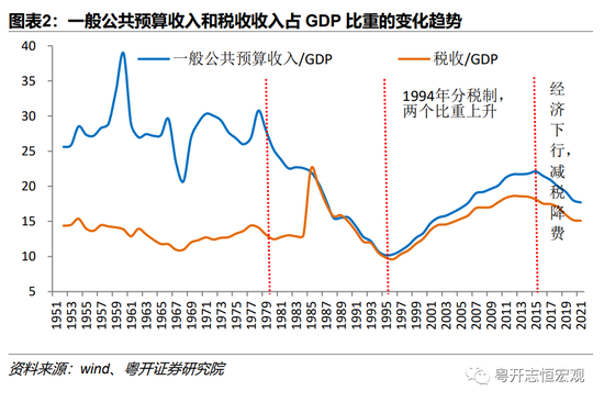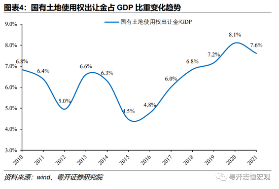 一是经济持续下行加之大规模减税降费,宏观税负持续下行,财政汲取能力下降。2008年国际金融危机之后,我国经济总体上持续下行,期间虽因逆周期调节有所波动,但不改整体下行趋势。疫情爆发以来的三年,大规模减税降费退税等措施持续出台以稳定经济,宏观税负持续下行。2021年一般公共预算收入与GDP之比为17.7%,税收收入与GDP之比仅有15.1%,为2015年以来最低水平,预计2022年还要进一步下降。减税降费固然提高了市场主体的抗风险能力,但是在居民和企业预期较弱的背景下,难以转化为企业的投资和居民的消费,即分子端减税降费推升了债务、分母端经济增长不明显,因此地方政府的负债率和债务率进一步攀升。未来随着土地出让收入下行,地方政府财政汲取能力下降。