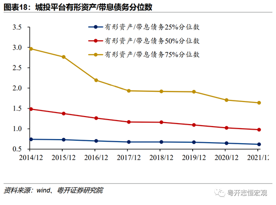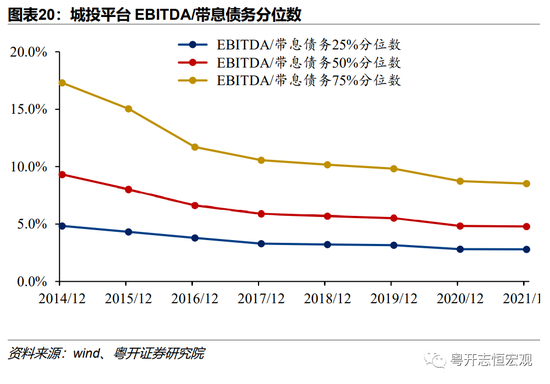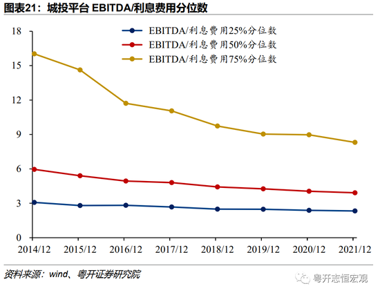 二城投平台还本付息能力逐年下降。从还本能力来看,以有形资产/城投平台带息债务衡量还本能力,自2014年以来整体呈现出下降趋势,2021年该数值中位数仅为1.0,即变卖所有有形资产刚刚够偿还所有带息债务。以经营活动产生的现金流、EBITDA对企业带息债务的覆盖能力也较差,2014-2021年城投平台经营活动产生的现金流净额/带息债务大于1的占比较小,2021年仅有0.02%,EBITDA/带息债务也呈现逐年下降趋势,2021年中位数仅为5.0%。从付息能力来看,企业利润对利息的覆盖亦呈下降趋势,2021年EBIT/利息费用中位数仅为2.8,加回折旧摊销后 EBITDA/利息费用中位数也仅有3.9。