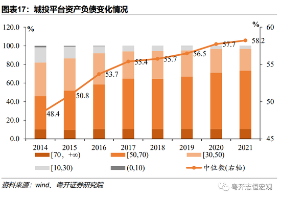 一是城投平台资产负债率缓慢抬升。从2014-2021年,城投平台资产负债率中位数上升到2021年的58.2%,较2014年提高9.8个百分点。从整体资产负债率分布来看,近1/10的城投公司资产负债率超过 70%,62.6%的城投公司资产负债率分布在50%~70%。
