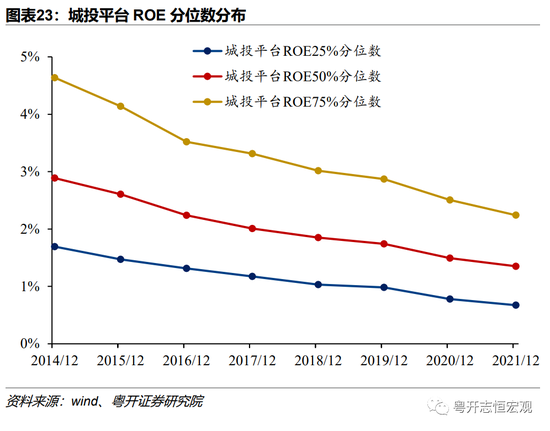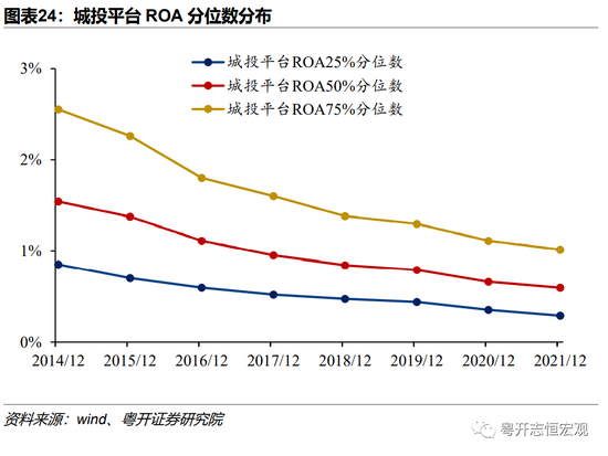 三是城投平台盈利能力较弱,ROA中位数不足1%。城投平台盈利能力较弱,与一般企业债相比财务数据上并不具有投资吸引力。净资产收益率的中位数从2014年的2.9%下降至2021年的1.4%,总资产收益率的中位数从2014年的1.5%下降到2021年的0.6%。