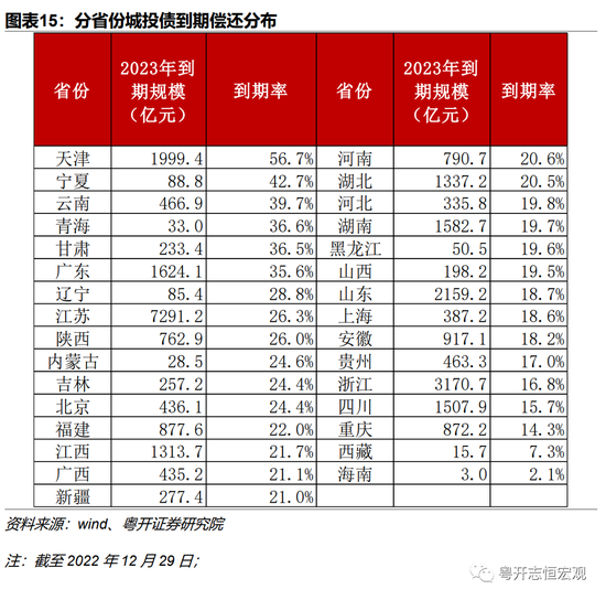 城投短期债务占比较高,债务滚续频繁。在城投平台有息债务中,短期债务规模占比达到24.5%,意味着一年内近四分之一债务需要借新还旧。从城投债到期分布来看,2021-2025年是城投债到期高峰期,年均到期量达到3.2万亿。从地区分布来看,天津和宁夏面临较高的到期压力,2023年到期城投债在存续债中的占比高达56.7%和42.7%,居全国前列,两地城投平台在2023年面临较高的还债压力。从行业分布来看,建筑装饰、交通运输、房地产三个行业年内城投债到期规模较大,分别达到19245亿元、3706亿元和2806亿元,占上年末存量债券的比分别为20.7%、30.7%和24.9%。