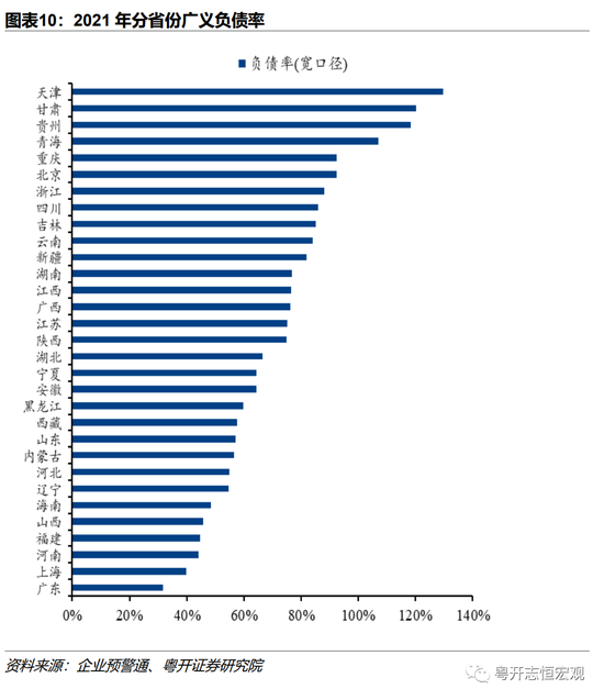 地方政府显性债务压力可控,债务风险主要集中在城投平台等主体形成的隐性债务。截至2021年底,我国地方政府债务率为105.4%,负债率26.7%,显性债务压力尚可控。分省份来看,8个省份的债务率超过120%,其中天津、贵州、内蒙古和云南4个省份超过150%,分别达到205.2%、157.0%、153.2%和152.3%。但是考虑融资平台的有息债务后,整体偿债压力较大,尤其是中西部财政实力较弱的省份。截至2021年底,考虑城投平台有息债务后,我国地方政府广义债务率和广义负债率分别达到259.5%和65.7%,均处于较高水平。分省份来看,广义债务率超过300%的省份有9个,其中天津、北京和重庆分别为530.0%、382.5%和378.3%;广义负债率最高的省份分别是天津、甘肃、贵州和青海四省,负债率超过100%,分别达到129.7%、120.2%、118.3%和107.1%。