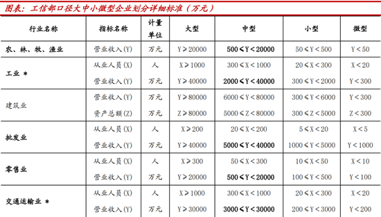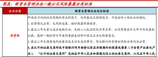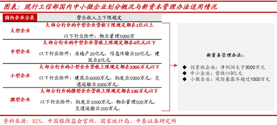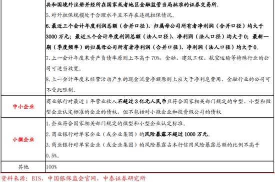 1、投资级企业是指即使在不利的经济周期和商业环境下,仍具备充足偿债能力的公司,但不包括对小微企业的债权,并要满足监管规定的八项条件,其中主要包括:“在认可的证券交易所或中国银行间市场登记有在存续期内的股票或债券(不含资产证券化产品”、“最近三个会计年度利润总额(合并口径)、归属母公司所有者净利润(合并口径)均大于3000万元;最近三个会计年度利润总额(法人口径)、净利润(法人口径)均大于0;最新一期(季度频率)的归属母公司所有者净利润(合并口径)、净利润(法人口径)均大于0”、“上一会计年度末资产负债率原则上不高于70%,金融、建筑工程、航空运输等特殊行业的公司可适当放宽”等。新资本管理办法将投资级风险权重设定为75%,相较巴Ⅲ最终版的65%较高,但相比现行的100%仍大幅降低,商业银行可基于这八项条件筛选存量客户中的投资级企业,并在下阶段优质企业的贷款等服务竞争中更为激烈,利好银行增配优质企业信用债。2、中小企业是指最近1年营业收入不超过3亿元人民币且符合国家相关部门规定的中型、小型和微型企业认定标准的企业的债权。风险权重由现行100%降至85%。从工信部口径看,大部分中型企业符合新资本管理办法中小企业的标准,风险权重有望从100%下降至85%。3、小微企业仍维持75%权重。