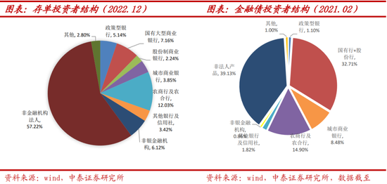 (2)针对第一档银行,划分为ABC级银行债权,3M以上同业存单、金融债风险权重由25%提升至40%;信用风险评级低的银行发行的存单/金融债风险权重将提升更高。针对第二档银行,不进行银行评级划分,权重统一提升至40%。从投资者结构看,同业存单投资者结构中银行持有34%,其中农商行及农合行持有最多、占比13%,其次为大行、占比7.6%。金融债投资者结构中银行合计持有59%,其中国股行合计持有33%,农商行及农合行持有15%。