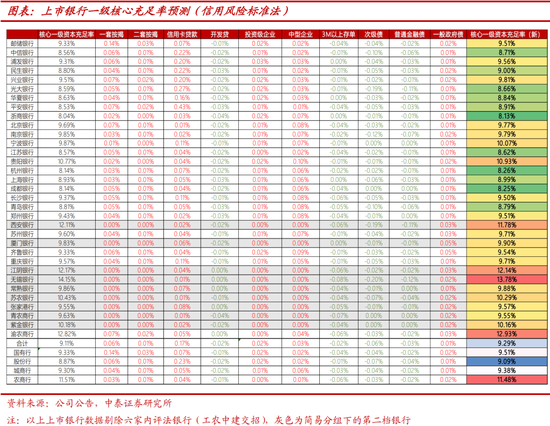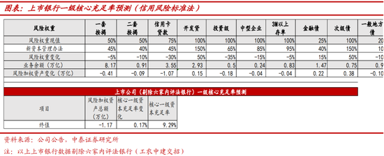 综合以上分析,我们结合标准法下相关假设对主要影响项目进行推测,并对下阶段上市银行一级核心资本进行测算,以下上市银行数据均为剔除内评法六家行(工农中建交招)的剩余上市银行数据。