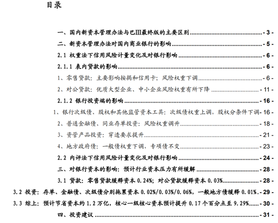 3、对资本影响测算:预计核心一级资本可以提升0.17%。我们测算:零售贷款可以缓释资本0.24%;对公贷款缓释0.03%。同业存单拖累0.02%;金融债拖累0.03%;次级债拖累0.06%;一般地方债缓释0.01%。综合考虑贷款和金融投资,上市银行(剔除六家内评法银行)将节省资本1.2万亿,核心一级资本预计提升0.17个百分点至9.29%。