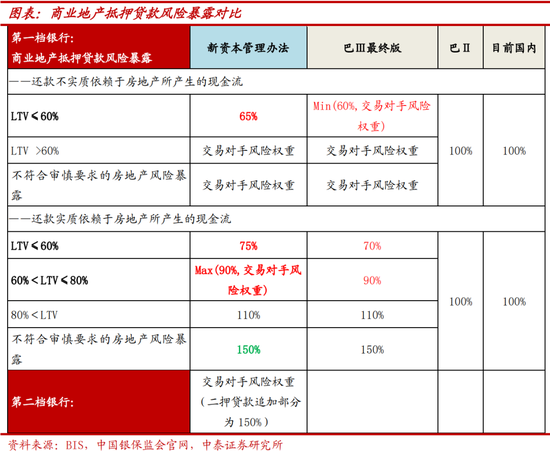 抵押物形式看,针对第一档银行,商业地产抵押贷款结合抵质押率情况来评定风险权重;由于国内抵质押率大多低于100%,因而风险权重计提压力有所下降。还款不实质依赖于房地产所产生的现金流,抵质押率小于等于60%,风险权重则取65%,相比巴Ⅲ最终版较高,但相比现行100%有所下调。抵质押率大于60%,风险权重则根据交易对手实际的抵质押率确定。